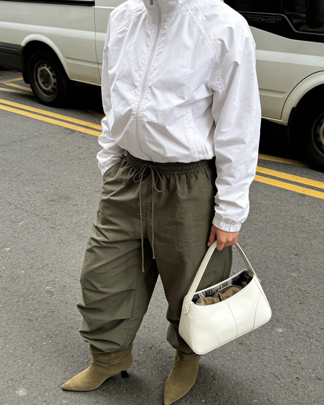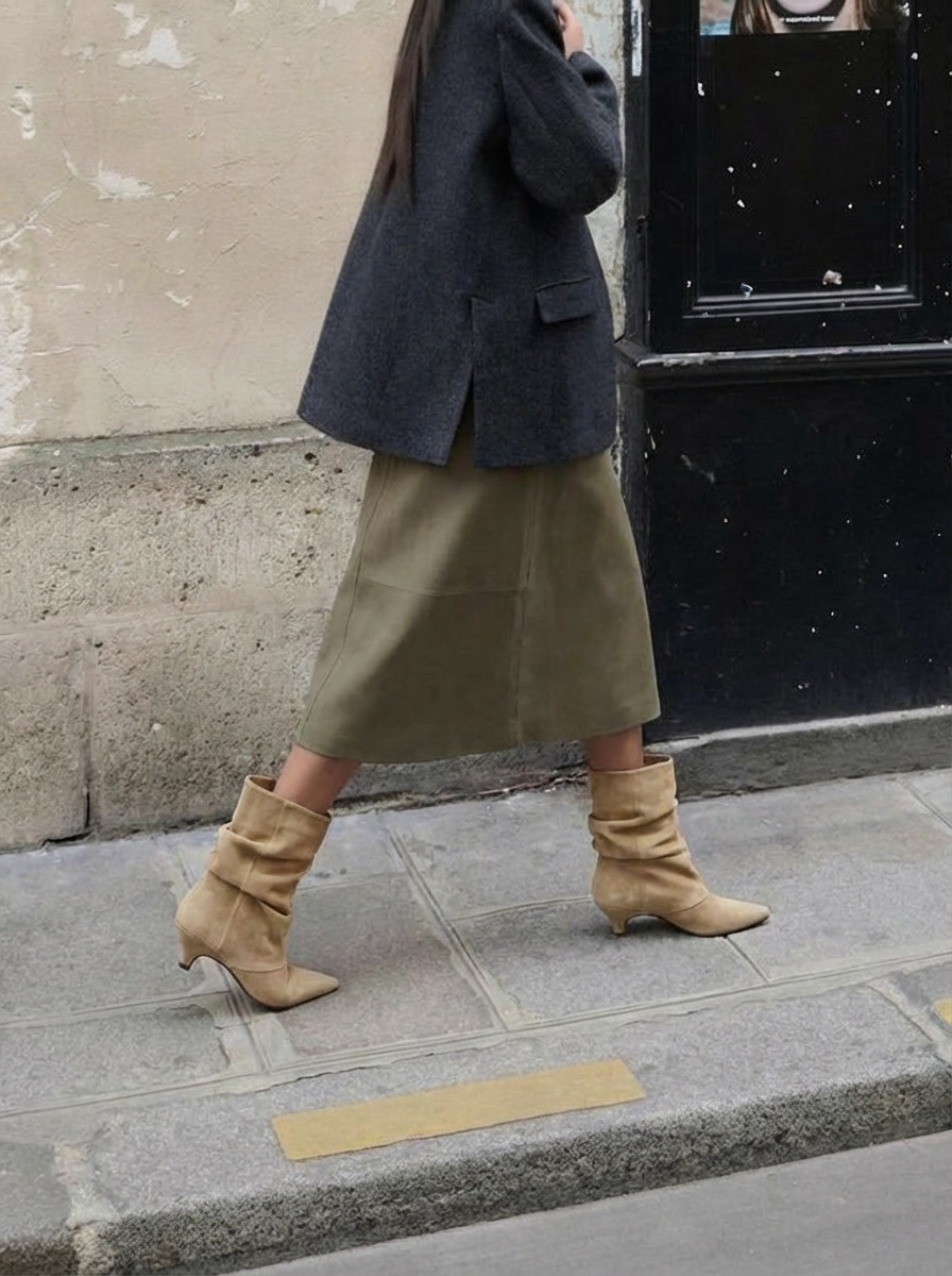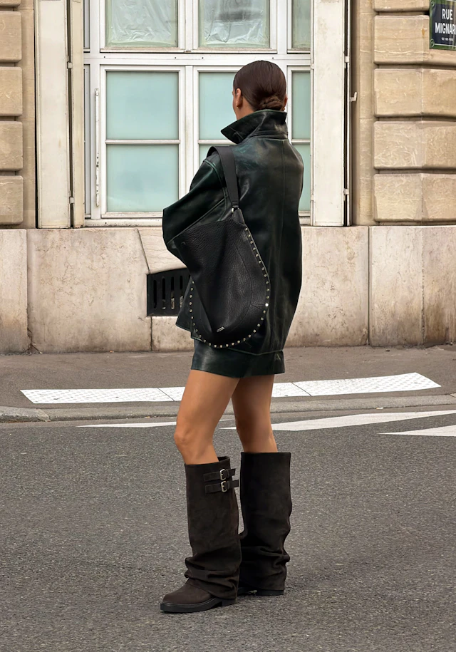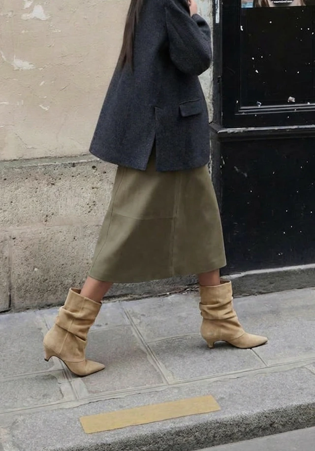 Fashion girls dragen slouchy boots op verschillende manieren. De meest gespotte outfit is een tucked in jeans gecombineerd met een licht suède laarsje. Op streetstyle niveau zie je slouchy boots veel onder oversized bermuda shorts. De looks voelen bewust gestyled, maar nooit geforceerd. Precies de “undone polish” waar 2026 om draait. Layering speelt hierin een sleutelrol. Denk aan zachte knitwear tegenover structured outerwear, of een minimal base met rijke texturen zoals suède en leer. Het gaat niet om meer items, maar om slimme gelaagdheid en tactiele contrasten die diepte creëren in je look.
